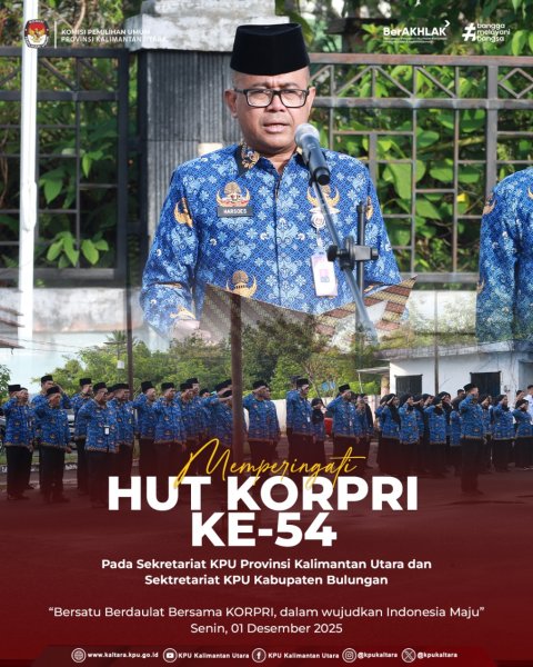 Komisi Pemilihan Umum Provinsi Kalimantan Utara (KPU Kaltara) bersama KPU Kabupaten Bulungan melaksanakan Upacara Peringatan Hari Ulang Tahun KORPRI ke-54 pada Jumat, 29 November 2025 di halaman GOR Dome Center. Upacara berlangsung khidmat dengan diikuti seluruh pegawai KPU yang tergabung dalam Korps Pegawai Republik Indonesia. Tahun ini HUT KORPRI mengusung tema “Bersatu, Berdaulat, Bersama KORPRI Mewujudkan Indonesia Maju.” Amanat upacara menegaskan komitmen ASN untuk terus menjaga persatuan, netralitas, integritas, serta meningkatkan profesionalisme dalam pelayanan publik. Selain itu, disampaikan pula dorongan agar ASN menjadi motor transformasi digital birokrasi, bekerja adaptif, efisien, dan inovatif demi mempercepat layanan kepada masyarakat. Melalui peringatan ini, KPU Kaltara dan KPU Kabupaten Bulungan menegaskan komitmen untuk terus memberikan layanan kepemiluan yang berintegritas, transparan, dan profesional, serta menjalankan nilai-nilai KORPRI dalam setiap pelaksanaan tugas. Upacara ditutup dengan doa dan harapan agar semangat pengabdian anggota KORPRI terus menguat sebagai bagian dari perjalanan menuju Indonesia Maju Korpri Setia Hingga Akhir. ....