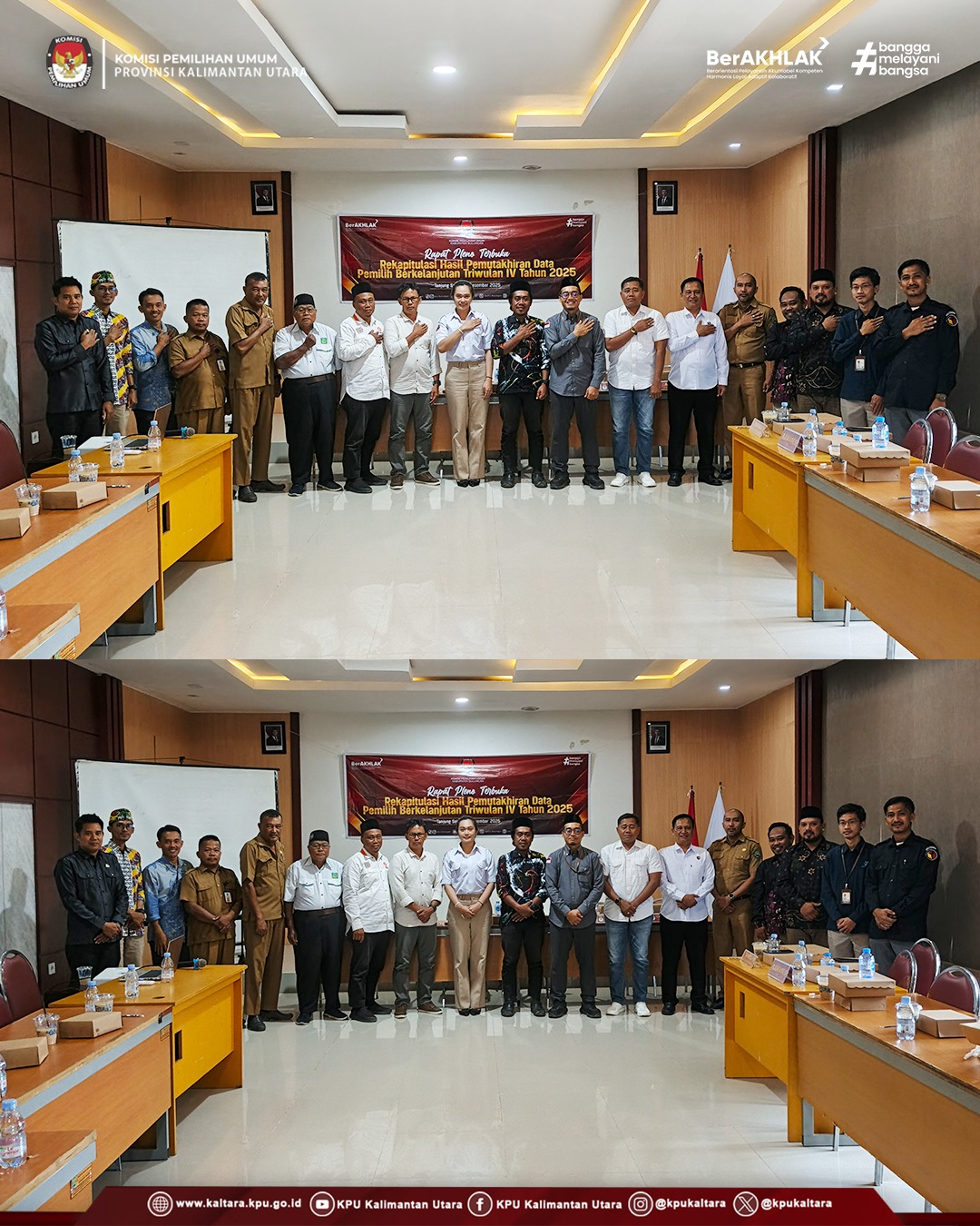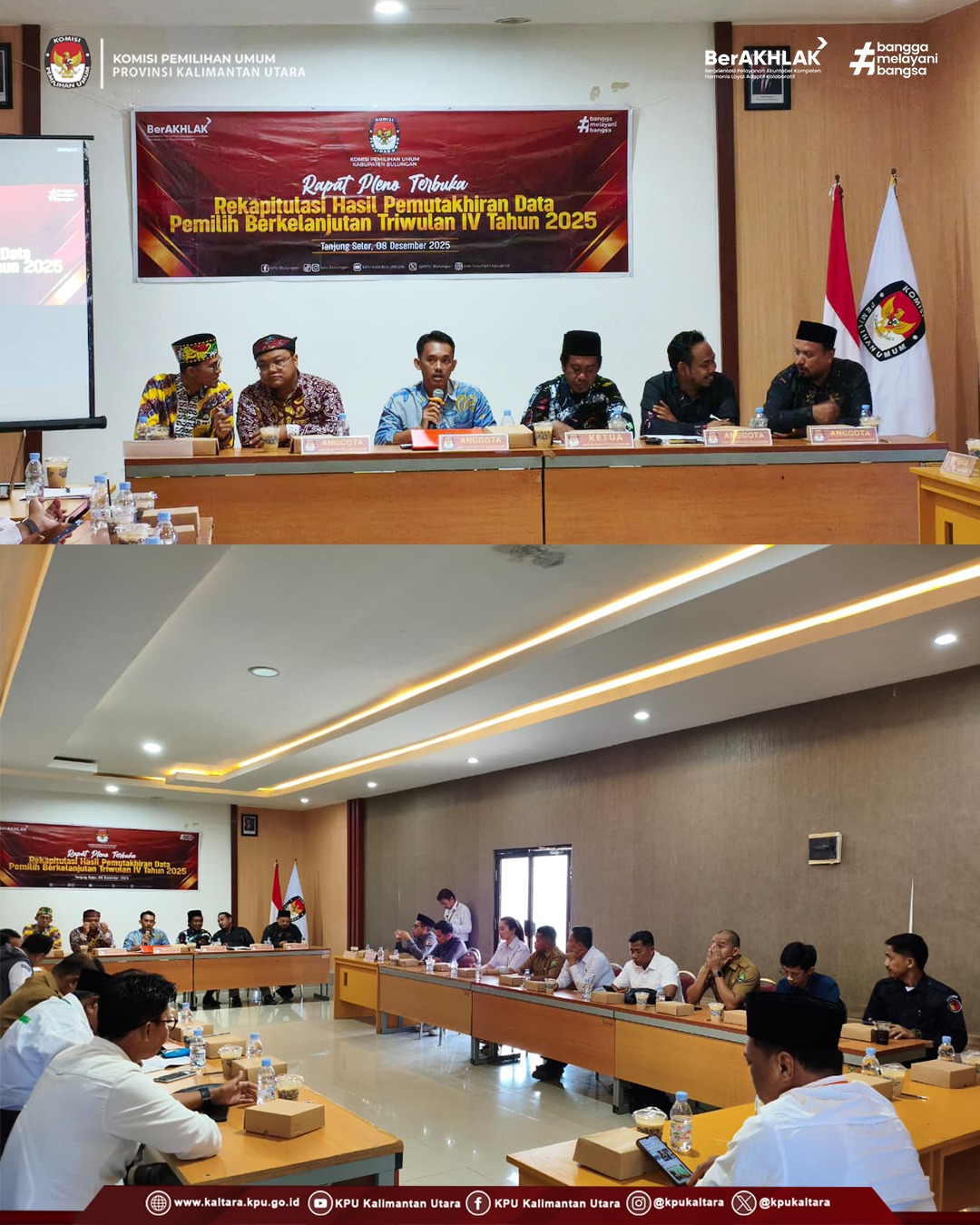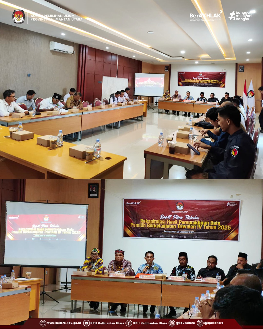 TANJUNG SELOR — KPU Provinsi Kalimantan Utara menggelar Rapat Pleno Terbuka Rekapitulasi Pemutakhiran Data Pemilih Berkelanjutan (PDPB) Triwulan IV Tahun 2025 pada Senin, 8 Desember 2025, bertempat di Gedung BKPSDM Kabupaten Bulungan.