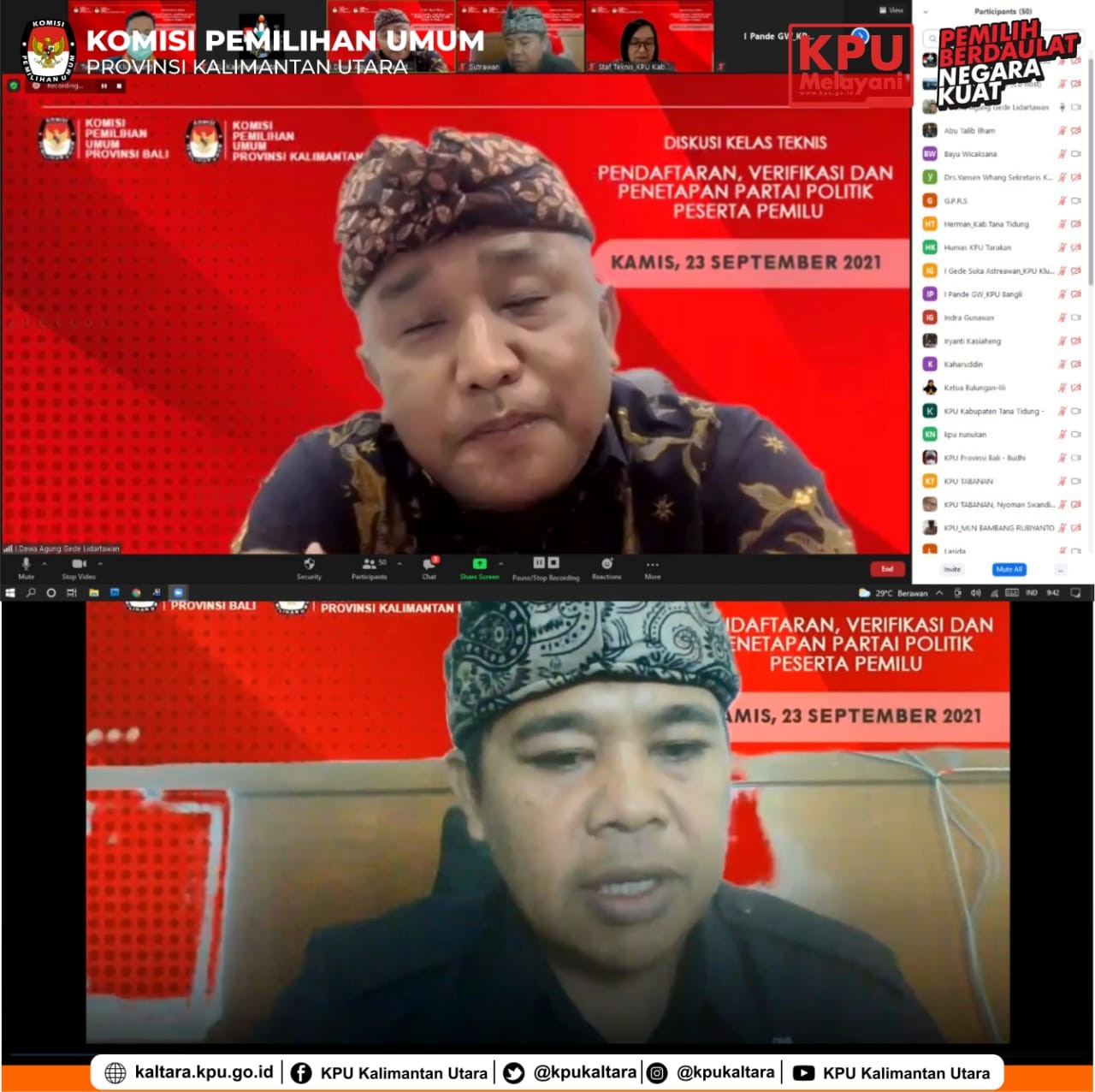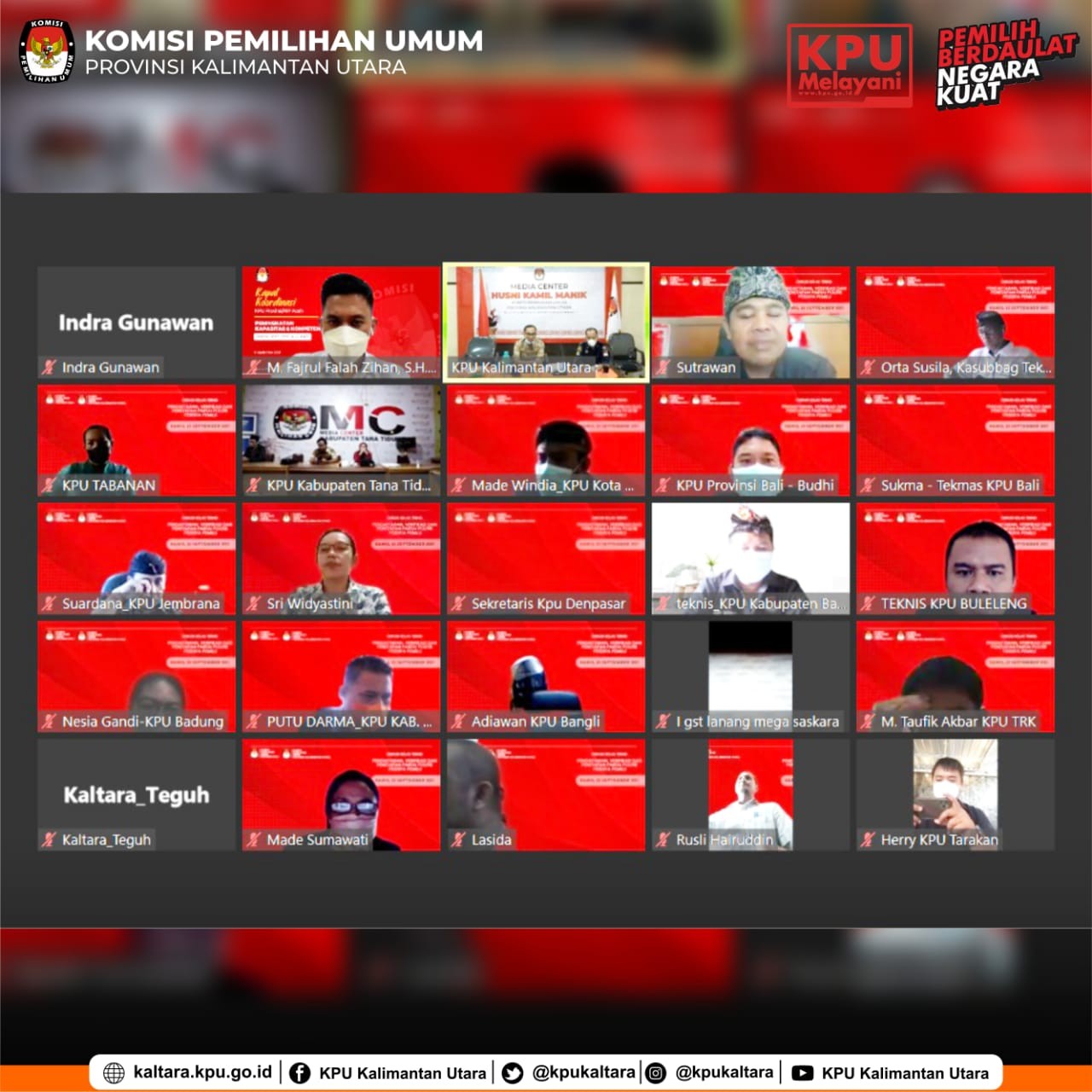 Tanjung Selor (23/09/2021) – KPU Provinsi Kalimantan Utara dan KPU Provinsi Bali menggagas kegiatan bersama yaitu kolaborasi dalam diskusi kelas teknis. Hal tersebut dimaksudkan untuk saling memperluas pengetahuan melalui sharing pengalaman antara kedua provinsi. Kegiatan direncanakan akan diselenggarakan dalam 2 tahap dengan narasumber dan moderator secara bergantian dari KPU Kabupaten/Kota kedua provinsi. Sementara KPU provinsi berperan memberi pengarahan dan penguatan. Kegiatan berlangsung secara daring melalui zoom meeting. Peserta dalam kegiatan diskusi tersebut meliputi semua KPU se-Kalimantan Utara dan KPU se-Bali, khususnya Anggota KPU Divisi Teknis Penyelenggaraan dan subbagian teknis KPU Provinsi maupun KPU Kabupaten/Kota kedua provinsi.