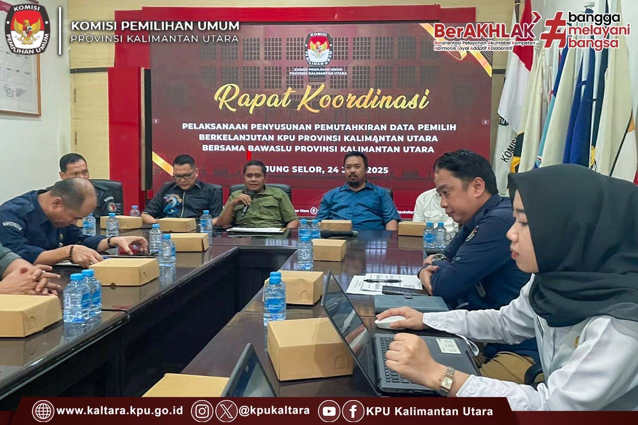 Tanjung Selor, 24 Juni 2025, Komisi Pemilihan Umum (KPU) bersama Badan Pengawas Pemilihan Umum (Bawaslu) Provinsi Kalimantan Utara menggelar Rapat Koordinasi Pelaksanaan Penyusunan Pemutakhiran Data Pemilih Berkelanjutan sebagai bagian dari upaya menjaga kualitas dan akurasi data pemilih.