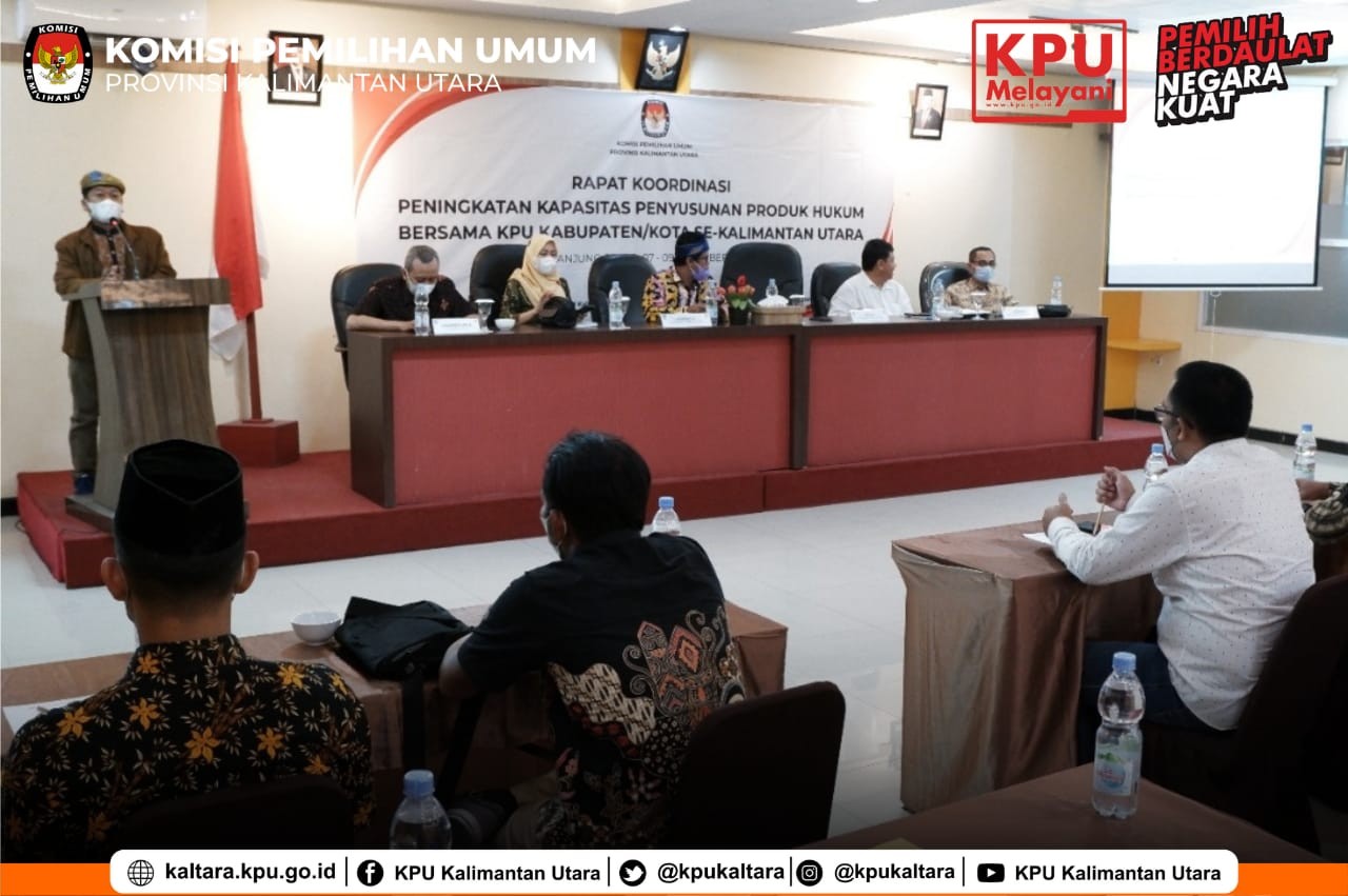 Kegiatan rakor peningkatan kapasitas produk hukum ini dilaksanakan berdasarkan arahan Komisi Pemilihan Umum Republik Indonesia yang telah melaksanakan rakor dengan tema yang sama sebelumnya pada bulan September 2021 dengan peserta KPU Provinsi di seluruh Indonesia. Berdasarkan kegiatan tersebutlah , kemudian KPU Provinsi Kalimantan Utara melaksanakan Rapat Koordinasi Peningkatan Kapasitas Penyusunan Produk Hukum bersama KPU Kabupaten/Kota se-Kalimantan Utara.