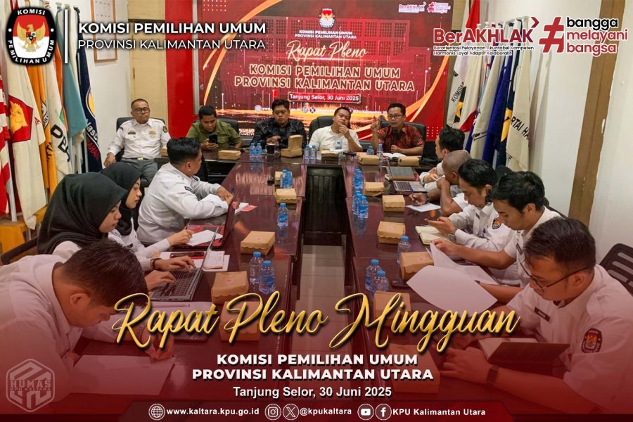 Tanjung Selor, 30 Juni 2025, KPU Provinsi Kalimantan Utara menggelar rapat pleno internal yang dihadiri oleh Sekretaris Provinsi, para Komisioner, Kepala Bagian, Kepala Subbagian, serta sejumlah staf sekretariat. Rapat ini dilaksanakan sebagai forum koordinasi rutin untuk membahas evaluasi pelaksanaan program kerja, progres kegiatan, serta langkah strategis ke depan dalam rangka menyukseskan tahapan pemilu. Kegiatan berlangsung dengan penuh semangat kolaborasi dan komitmen bersama untuk terus memperkuat tata kelola kelembagaan serta pelayanan publik yang transparan, akuntabel, dan profesional. dalam sambutannya, Ketua KPU Provinsi Kalimantan Utara menyampaikan pentingnya sinergi antarbagian serta soliditas internal sebagai landasan utama untuk mendukung kelancaran seluruh proses penyelenggaraan pemilu yang demokratis dan berintegritas. Beberapa poin utama yang menjadi pembahasan dalam rapat pleno kali ini antara lain: 1. Peningkatan Partisipasi Masyarakat KPU Provinsi dan Kabupaten/Kota diminta meningkatkan partisipasi masyarakat secara berkelanjutan melalui koordinasi dan sosialisasi terjadwal oleh Divisi Sosialisasi dan Parmas. 2. Koordinasi Divisi Datin dan Teknis Pembahasan mengenai Daftar Pemilih Berkelanjutan (DPB) dan data partai politik yang akan digelar beberapa waktu kedepan. 3. Pengajuan Anggaran Non-Tahapan Pengajuan resmi kepada pemerintah daerah untuk mendukung kegiatan non-tahapan dan infrastruktur. 4. Usulan Regulasi TPS Khusus KPU akan mengajukan dasar hukum pembentukan TPS di wilayah khusus. 5. Inventarisasi Dokumentasi Pemilu Seluruh dokumentasi tahapan pemilu terdahulu dikumpulkan guna keperluan arsip kelembagaan. 6. Aktivasi Rapat Pleno Pleno luring wajib digelar minimal seminggu sekali. Pleno KPU Provinsi dijadwalkan setiap Senin pukul 10.00 WITA. Seluruh dokumentasi rapat wajib dilengkapi. 7. Pelaporan Anggaran dan Pengawasan Internal 8. SPIP dan Manajemen Risiko Pelaporan SPIP dilakukan berkala. Subbagian Hukum menyusun dan memaparkan manajemen risiko untuk ditindaklanjuti. 9. Inventarisasi dan Logistik Subbagian Logistik wajib mengikuti instruksi KPU RI, mengoptimalkan SDM, serta memaksimalkan ruang podcast untuk sosialisasi. Perlunya peningkatan terkait fasilitas studio. 10. Perencanaan dan Pengajuan Kegiatan Setiap divisi menyusun rencana kegiatan yang dikompilasi Subbagian Perencanaan. Hasil akhir akan dibahas dalam pleno paling lambat pertengahan Juli 2025. Melalui forum pleno internal ini, KPU Provinsi Kalimantan Utara berharap dapat terus meningkatkan efektivitas kerja lembaga, serta memastikan seluruh tahapan penyelenggaraan pemilu berjalan dengan baik, transparan, dan akuntabel.