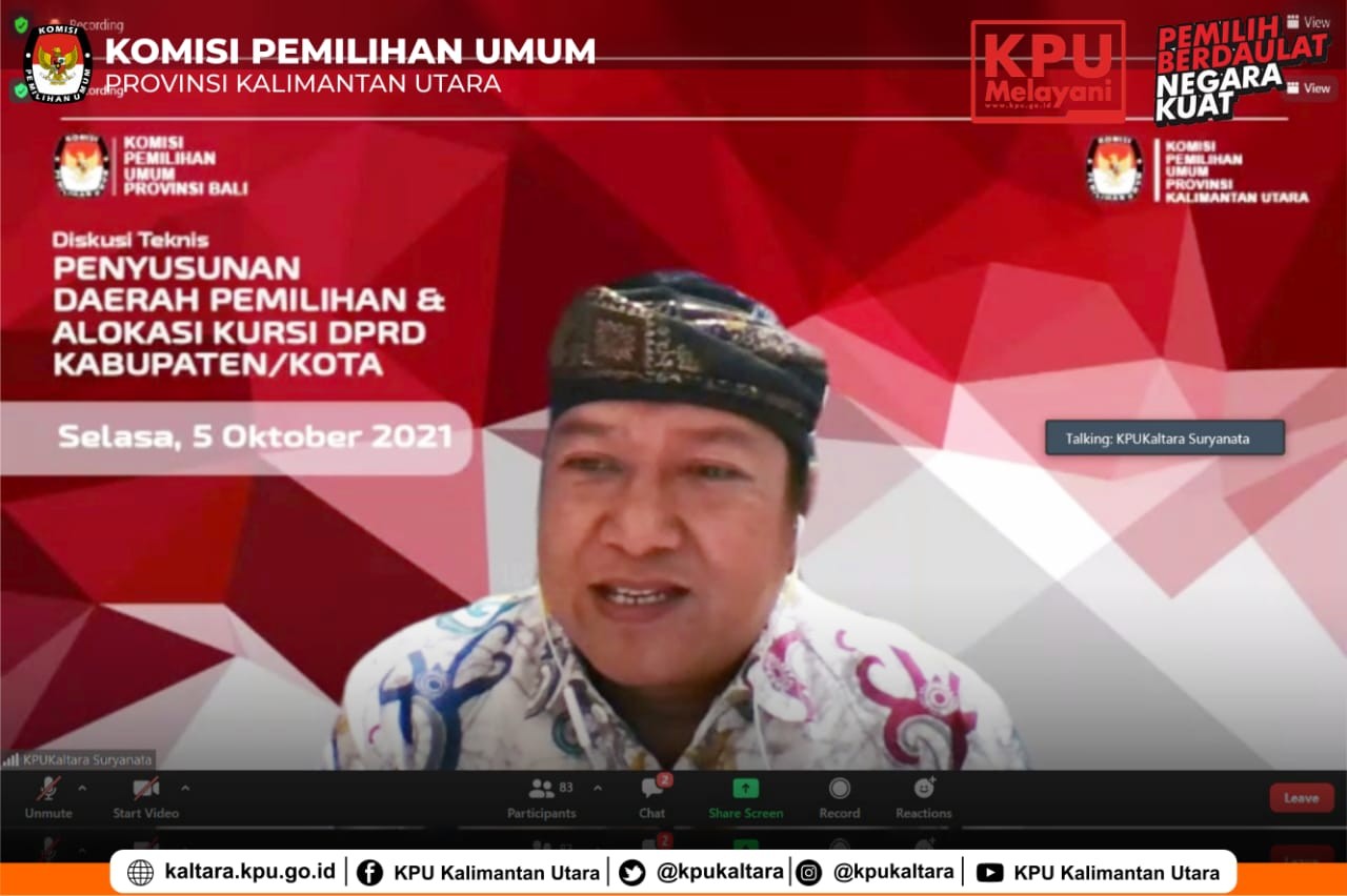 Tanjung Selor (05/10/2021) – KPU Provinsi Kalimantan Utara dan KPU Provinsi Bali menggelar kegiatan diskusi kelas teknis tahap II. Pada diskusi kali ini, mengusung tema “Penyusunan Daerah Pemilihan dan Alokasi Kursi DPRD Kabupaten/Kota”. Pemateri utama pada kegiatan tersebut yaitu Kaharuddin, Divisi Teknis Penyelenggaraan Anggota KPU Kabupaten Nunukan Kalimantan Utara dan sebagai moderator yaitu I Made Windia, Divisi Teknis Penyelenggaraan Anggota KPU Kota Denpasar Provinsi Bali. Kegiatan berlangsung pada Selasa, 5 Oktober 2021 secara daring. Peserta dalam kegiatan diskusi tersebut meliputi semua KPU se-Kalimantan Utara dan KPU se-Bali, khususnya Anggota KPU Divisi Teknis Penyelenggaraan dan subbagian teknis KPU Provinsi maupun KPU Kabupaten/Kota kedua provinsi. Penentuan Daerah Pemilihan (Dapil) merupakan tahapan awal pada proses teknis penyelenggaraan pemilu. Meskipun penentuan akhir Dapil menjadi keputusan KPU Republik Indonesia, namun KPU Kabupaten/Kota khususnya dalam hal ini mengambil peran yang sangat penting, karena KPU Kabupaten/Kota yang melakukan kajian awal pengusulan penataan dapil. Oleh karena itu, kegiatan diskusi untuk memperdalam kajian regulasi maupun sharing pengalaman dalam penataan dapil merupakan hal yang penting dilakukan. Kedua daerah provinsi memang memiliki karakteristik wilayah yang berbeda, namun dalam proses penentuan dapilnya mengacu pada regulasi yang sama, yaitu Peraturan Komisi Pemilihan Umum maupun regulasi lain yang diterbitkan oleh KPU Republik Indonesia. Pada sesi diskusi, membahas mengenai prinsip-prinsip dalam penataan Dapil. Setidaknya terdapat 7 prinsip dalam penataan Dapil sebagaimana diatur dalam Peraturan Komisi Pemilihan Umum Republik Indonesia Nomor 16 Tahun 2017 tentang Penataan Daerah Pemilihan dan Alokasi Kursi Anggota Dewan Perwakilan Rakyat Daerah Kabupaten/Kota Dalam Pemilihan Umum. Ketujuh prinsip tersebut meliputi : kesetaraan nilai suara; ketaatan pada sistem pemilu yang proposional; proposionalitas; integralitas wilayah; berada dalam satu wilayah yang sama; kohesivitas; dan kesinambungan. Kedepan diharapkan diskusi baik dalam lingkup internal maupun eksternal KPU bisa terus ditingkatkan, untuk bersama-sama mendalami dan mengawal penyelenggaraan pemilu di Indonesia menjadi lebih baik. (Humas KPU Kaltara)