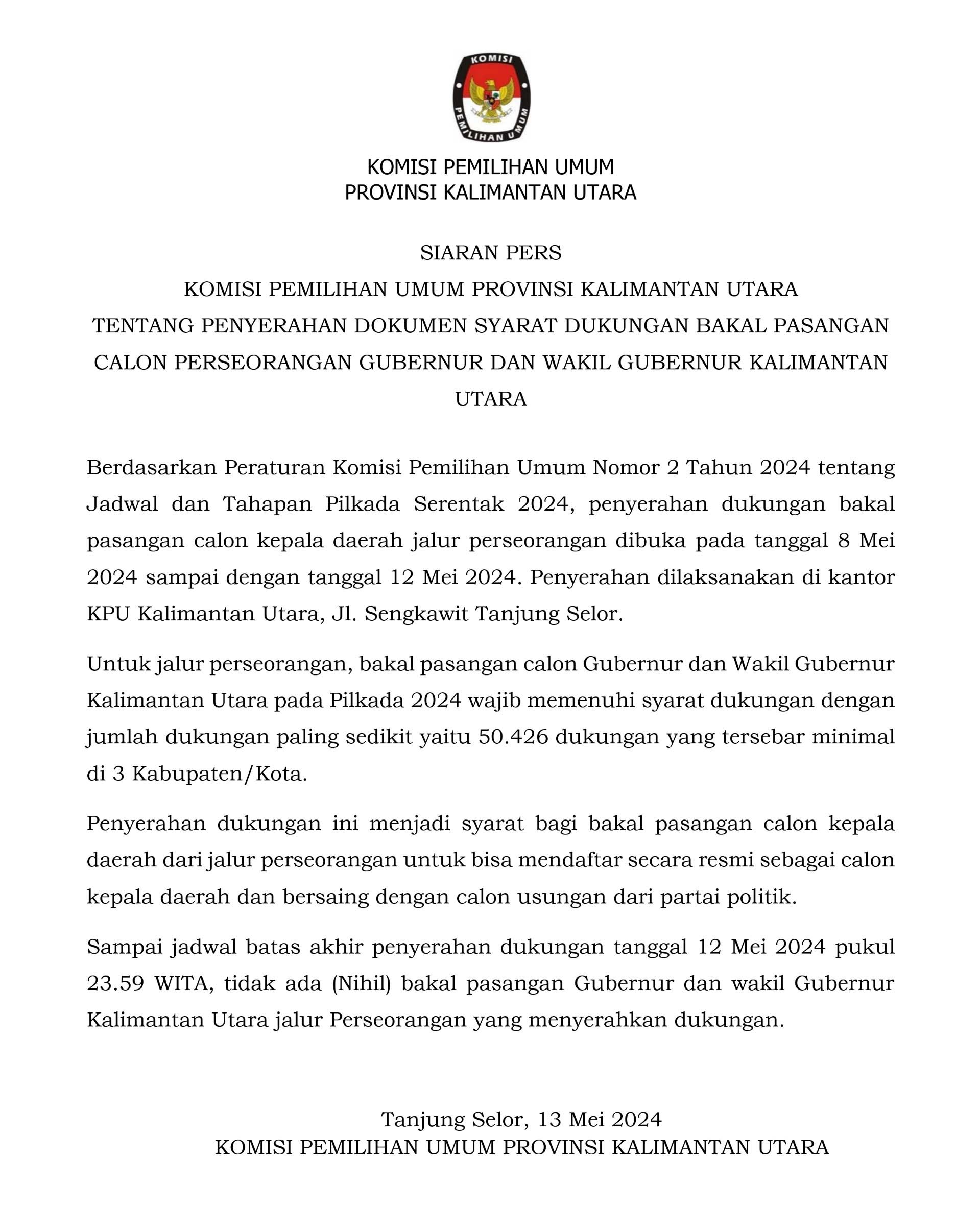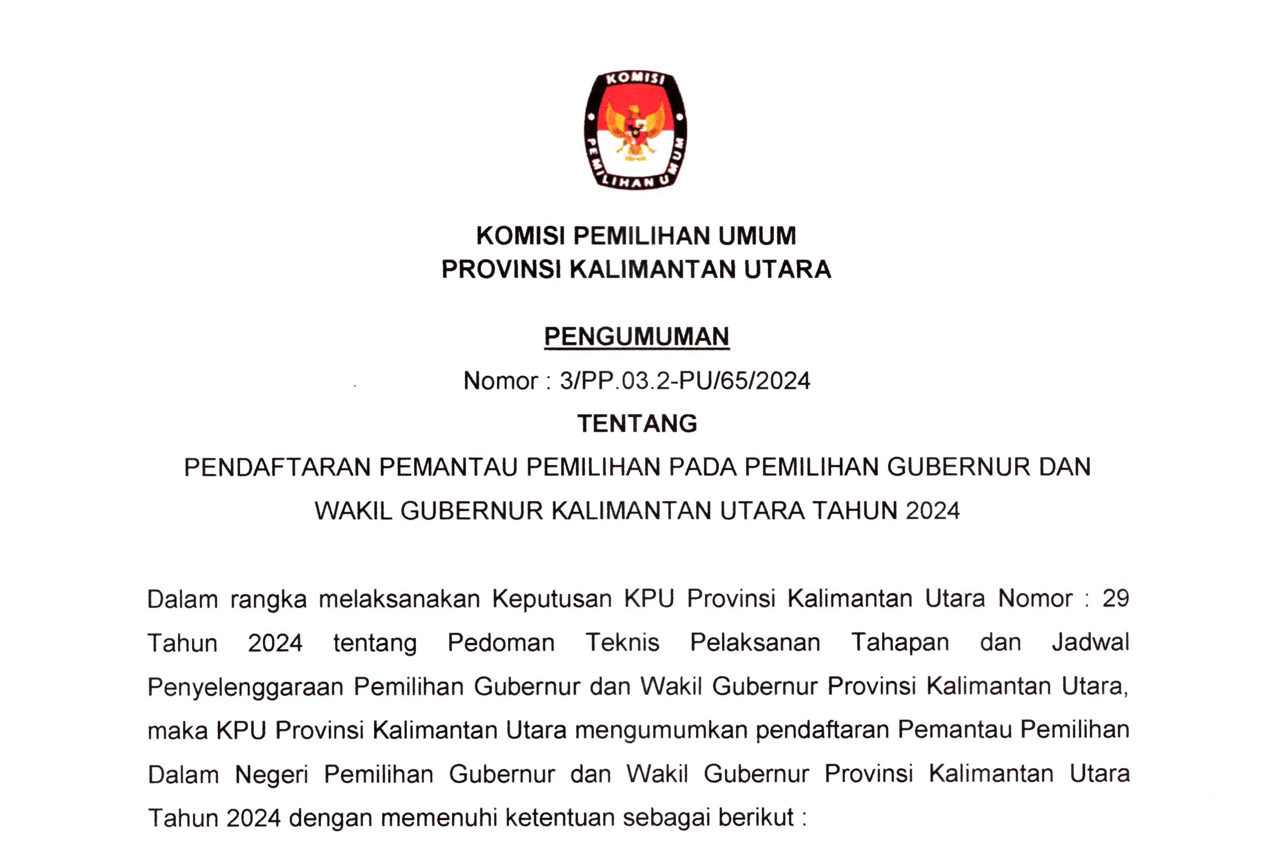 Pengumuman Nomor : 3/PP.03.2-PU/65/2024 Tentang Pendaftaran Pemantau Pemilihan Gubernur dan Wakil Gubernur Kalimantan Utara Tahun 2024