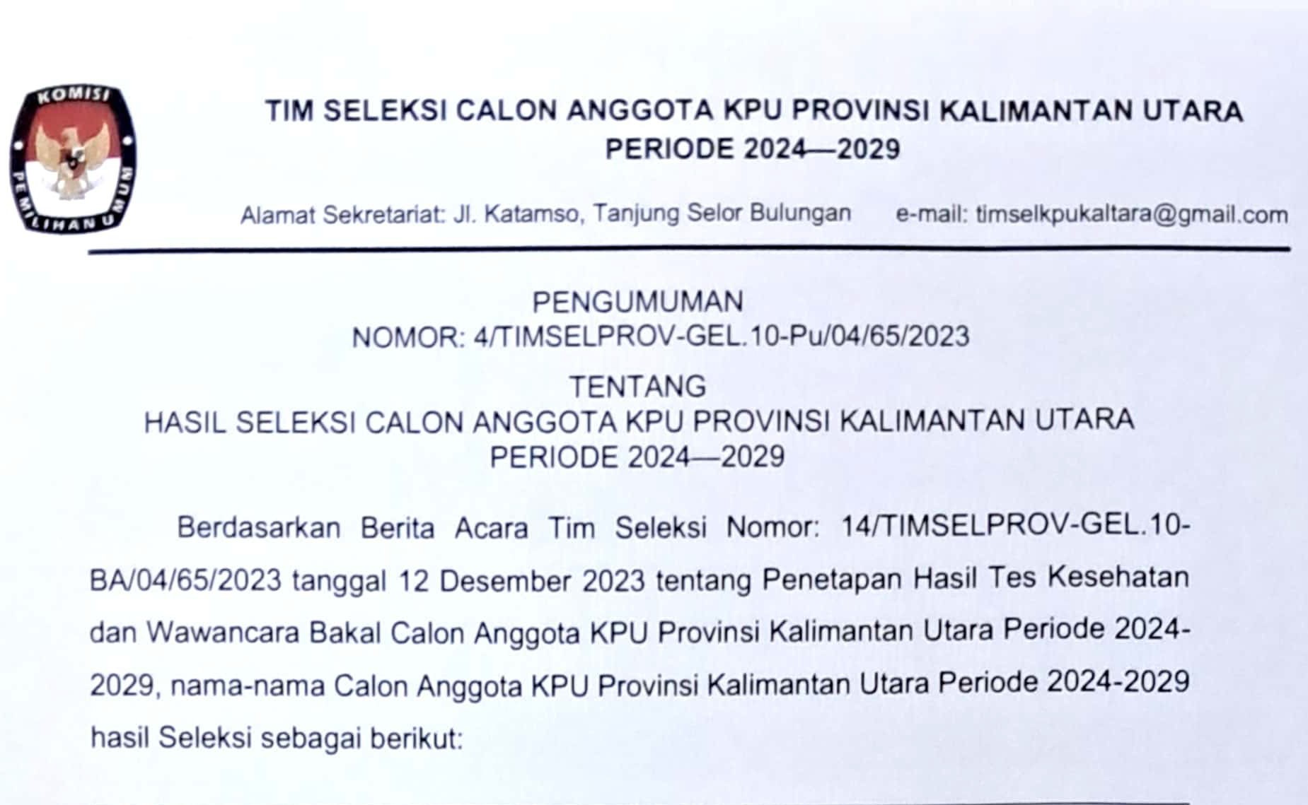 Tanjung Selor, kaltara.kpu.go.id - Berikut kami sampaikan Pengumuman Hasil Seleksi Tertulis dan Tes Psikologi Bakal Calon Anggota KPU Provinsi Kalimantan Utara Tahun 2024-2029.