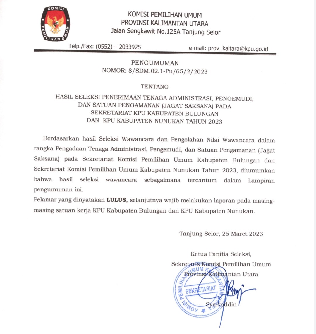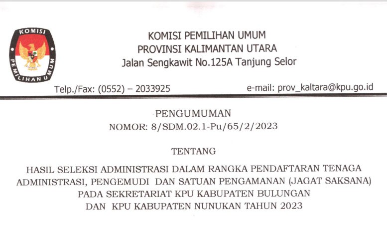 Pengumuman Hasil Seleksi susulan KPU Kabupaten Bulungan dan KPU Kabupaten Nunukan Senin, 27 Maret 2023 07:00 1355 Selengkapnya dapat diunduh DISINI Baca Selengkapnya