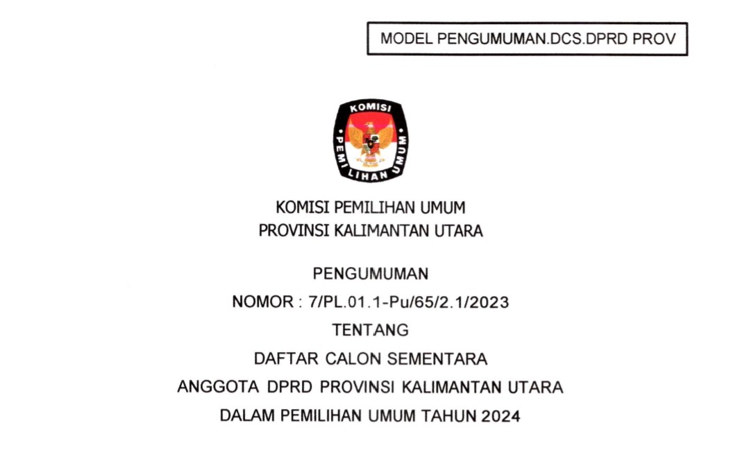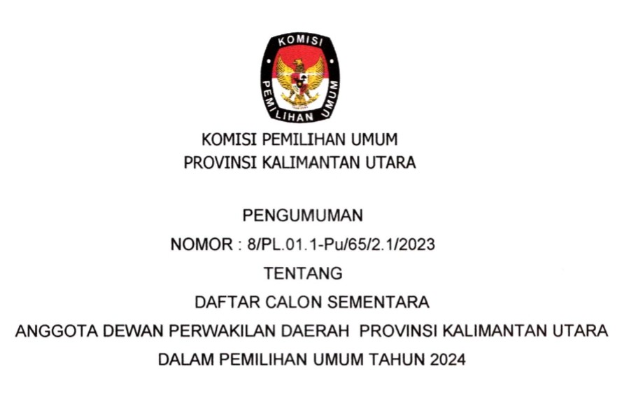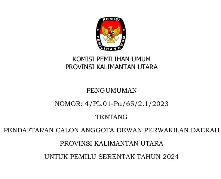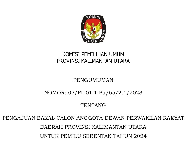 Pengumuman Pengajuan Bakal Calon Anggota Dewan Perwakilan Rakyat Daerah Provinsi Kalimantan Utara Untuk Pemilu Serentak Tahun 2024 Selasa, 25 April 2023 07:00 1527 Selengkapnya dapat diunduh DISINI Baca Selengkapnya